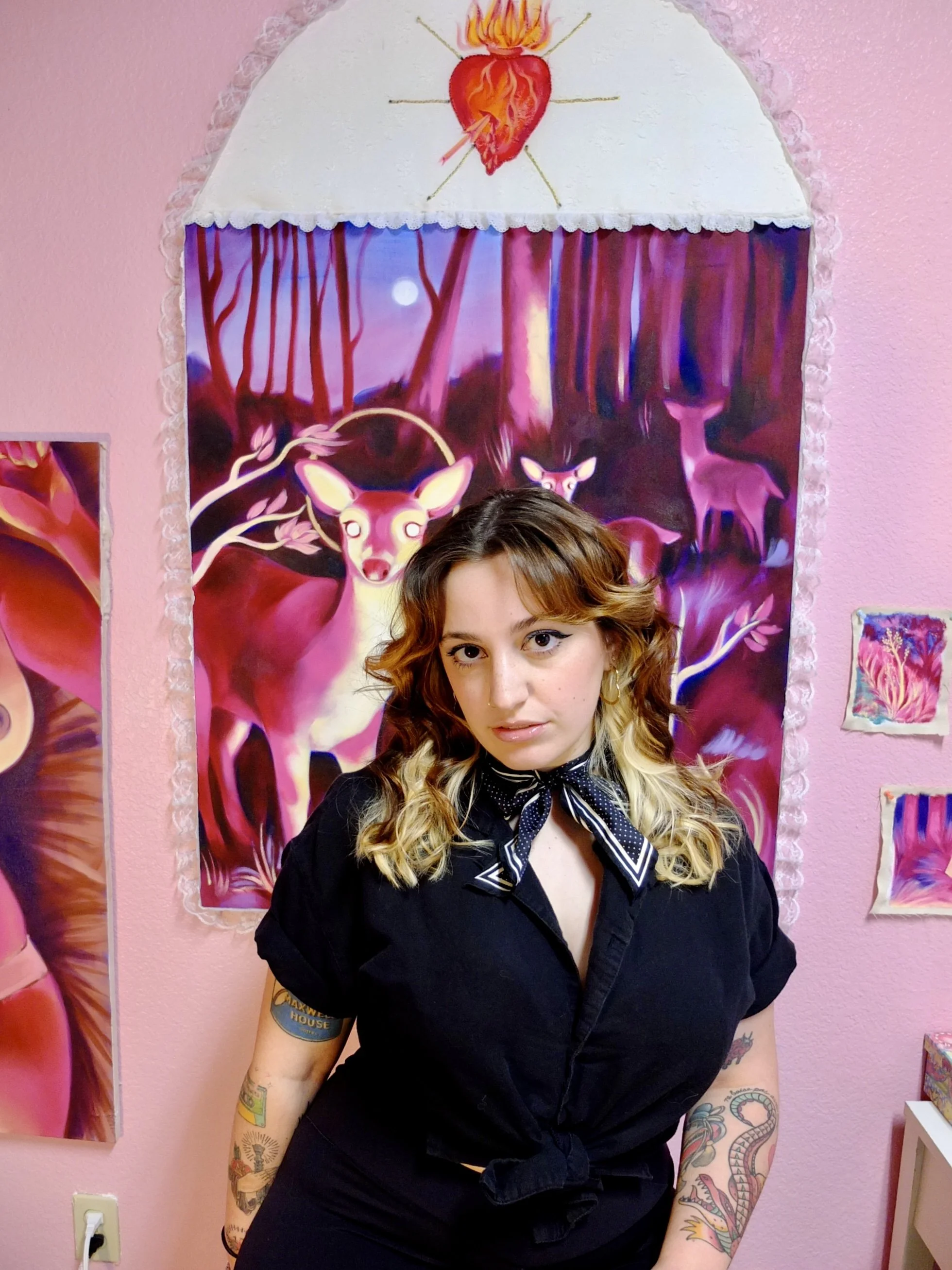 Lauren Fleniken is a painter from the small town of Montague, TX, and currently resides in the city of Denton. She works primarily with oil painting while incorporating other media in her work such as fabric and sculptural elements. She graduated Texas Christian University with her BFA in Painting in 2023, and has since been a working artist in the DFW metroplex. Fleniken is a current member of the Cedars Union, and was a member of Cohort 4. She has been featured in multiple shows with galleries such as 500x, Arts Fort Worth, Kettle Art, and Plush Gallery. She has previously been awarded Best in Show at the College Expo at 500x, which gained her her first solo show “are we alone now?” in the same space, and been awarded a Clare DeGoyler grant from the Dallas Museum of Art. She is currently working from her studio in the Tin District.